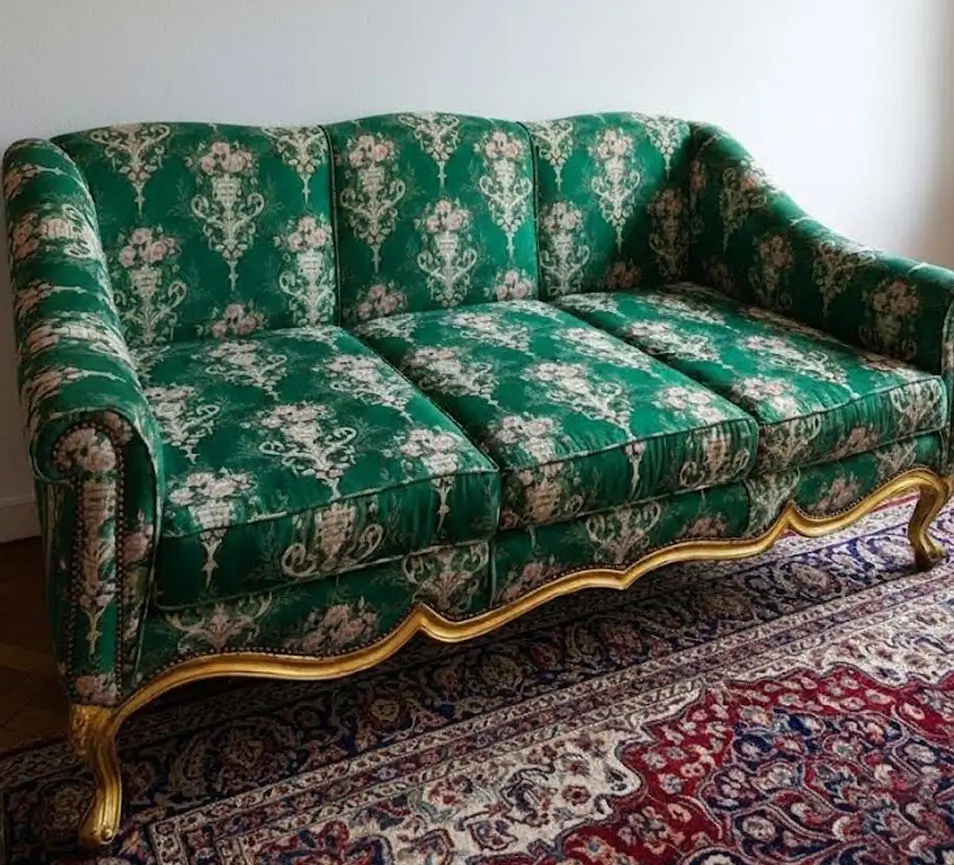 This stunning piece marries a sleek silhouette with vibrant, ornate upholstery. The design is defined by its graceful curves and meticulous subtle gold leafing along the base and cabriole legs. A perfect anchor for a maximalist living room or a classic study.